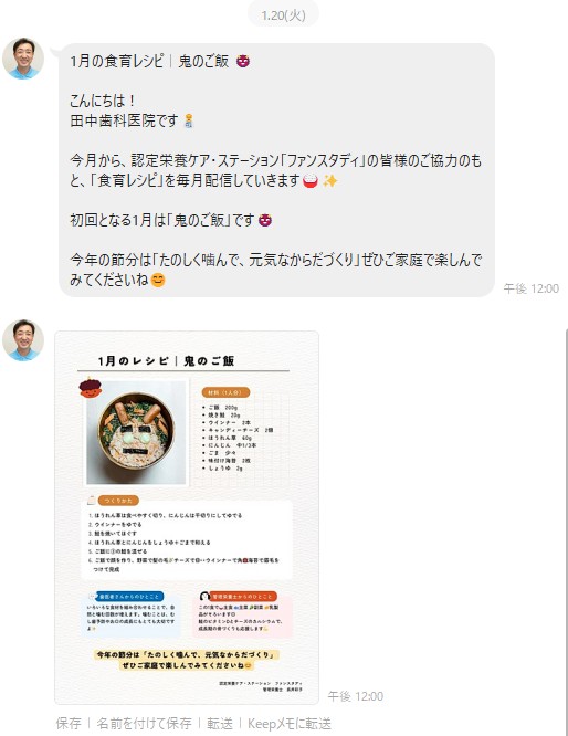 田中歯科医院の公式LINEで、認定栄養ケア・ステーション ファンスタディ管理栄養士による月1回のレシピ配信がスタートしました!