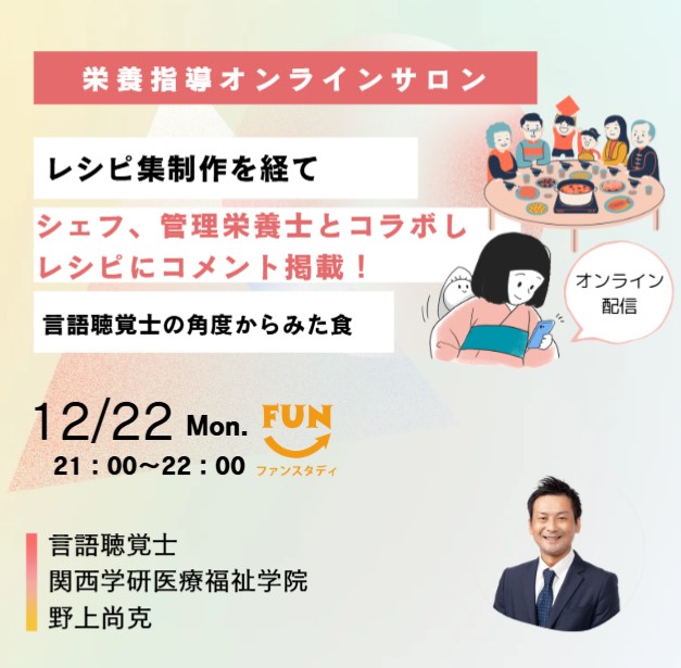 レシピ集は、とても勉強になりました^^レシピ集の中には、「嚥下食ポイント 言語聴覚士からの一言」が、私たち管理栄養士も知っておかないといけない重要な知識であると感じるとともに、もっと学ぶべきなのではと感じました。そこで、レシピの監修に関わられた言語聴覚士の野上先生に、栄養指導オンラインサロン講演をお願いすることになりました!