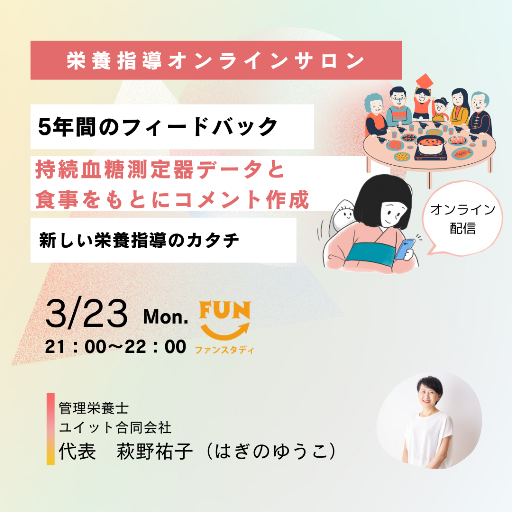 2020年度から、持続血糖測定器で測定した血糖値データと食事(画像)をもとに、関係性を分析しコメント作成をしていただく仕事を、栄養指導オンラインサロンの希望者と実施してきました。お声かけくださったのは、ファンスタディ講師の萩野祐子先生です。直接の栄養指導とは違い、コメントとして一旦アウトプット、それを萩野祐子先生がチェックをするというフローです。また、栄養指導オンラインサロンの希望者グループで、チームで進めています。そのため、活動の過程における学びが多く、今回5年間にわたる活動を通じてそのフィードバックの内容を共有していただくことになりました。