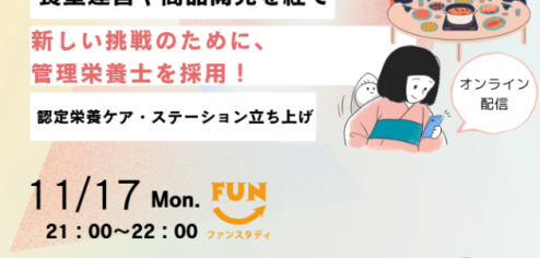 \食堂運営や商品開発を経て/新しい挑戦のために、管理栄養士を採用!認定栄養ケア・ステーション立ち上げ 神奈川県川崎市で食堂運営や商品開発を営まれている岩さんは、ファンスタディのことをネット検索で見つけて連絡をしてください … 続きを読む \食堂運営や商品開発を経て/ 新しい挑戦のために、 管理栄養士を採用! 認定栄養ケア・ステーション立ち上げ [2025年11月17日(月)]