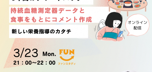 \5年間のフィードバック/持続血糖測定器データと食事をもとにコメント作成新しい栄養指導のカタチ2020年度から、持続血糖測定器で測定した血糖値データと食事(画像)をもとに、関係性を分析しコメント作成をしていただく仕事を、 … 続きを読む \5年間のフィードバック/ 持続血糖測定器データと食事をもとにコメント作成 新しい栄養指導のカタチ [2026年3月23日(月)]