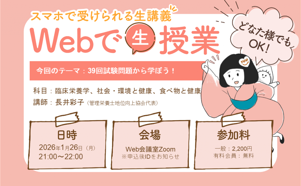 個別栄養食事管理加算、難病の定義、要介護者となった原因、介護保険制度における保険給付の財源、食品表示基準に基づく一般用加工食品の表示など、最新の国家試験である第39回試験問題のうち、つなげて学ぼう5・6の範囲を学びます。過去問から繰り返し出題されているもの、新しく出題された言葉と今までの出題との位置づけ、なぜそれが出たのかを予測してみるなど。様々な角度から学びます!